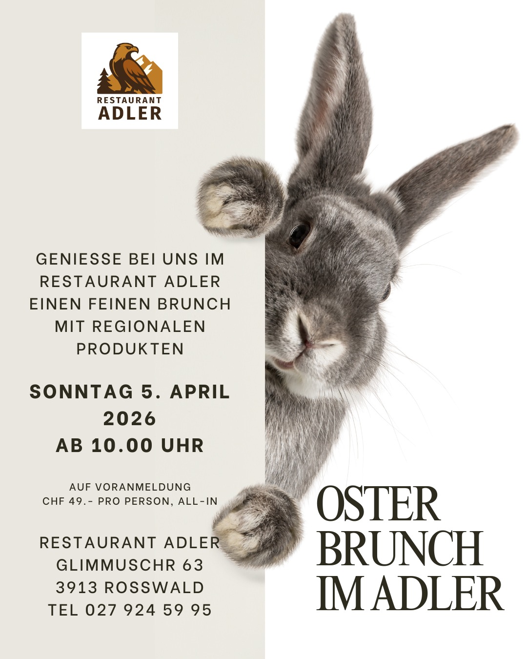 Der Frühling erwacht und das Osterfest steht vor der Tür! Was gibt es Schöneres, als diese besonderen Tage im Kreise der Familie und Freunde bei einem ausgiebigen, gemütlichen Brunch zu verbringen? Wir laden euch herzlich zu unserem Osterbrunch am Sonntag, 5. April 2026, zu uns ins Restaurant Adler auf dem Rosswald ein.