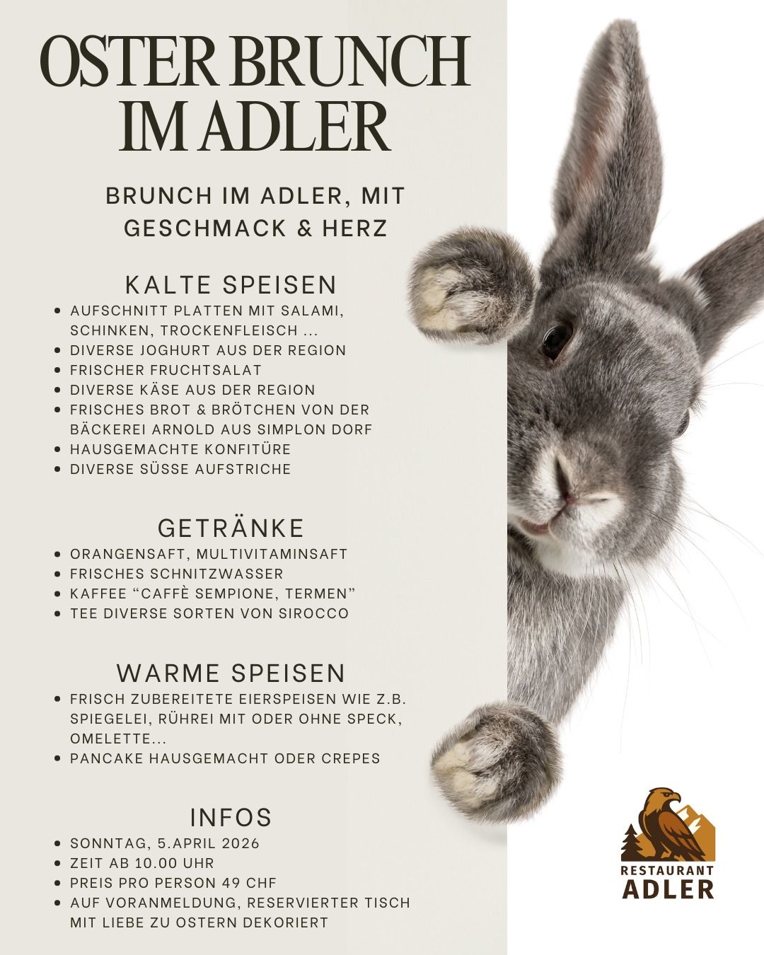 Unter dem Motto „Brunch im Adler, mit Geschmack & Herz“ haben wir ein reichhaltiges Angebot zusammengestellt. An eurem liebevoll österlich dekorierten, reservierten Tisch könnt ihr ganz entspannt in den Sonntag starten.