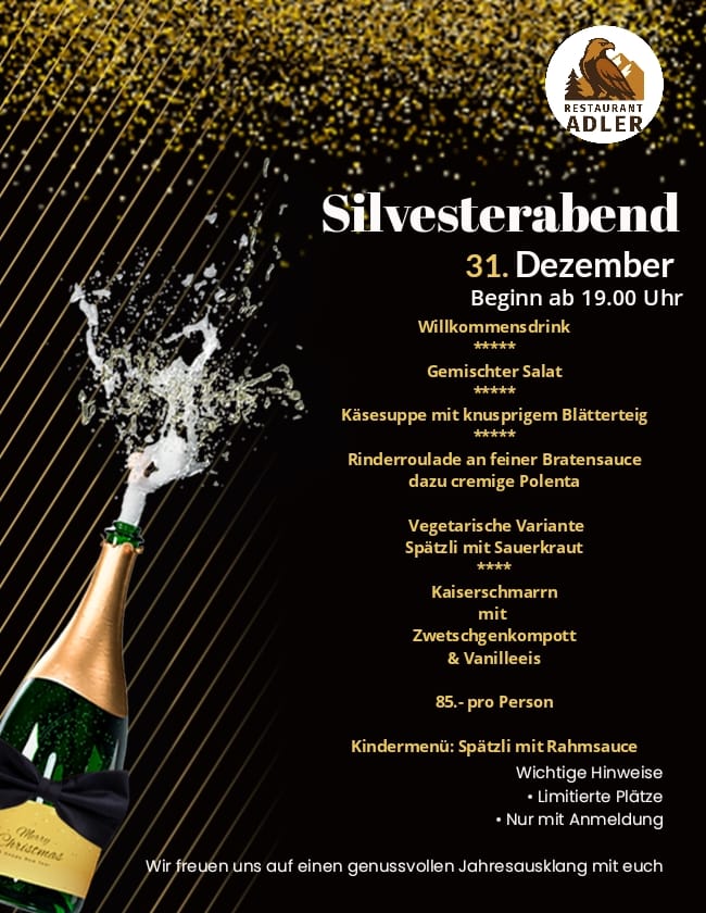 Verbringe den Jahreswechsel in gemütlicher Atmosphäre hoch über dem Rhonetal: Am 31. Dezember 2025 laden wir dich ab 19.00 Uhr zu einem genussvollen Silvesterabend im Restaurant Adler auf Rosswald ein. Freu dich auf ein festliches Menü und einen stimmungsvollen Jahresausklang.